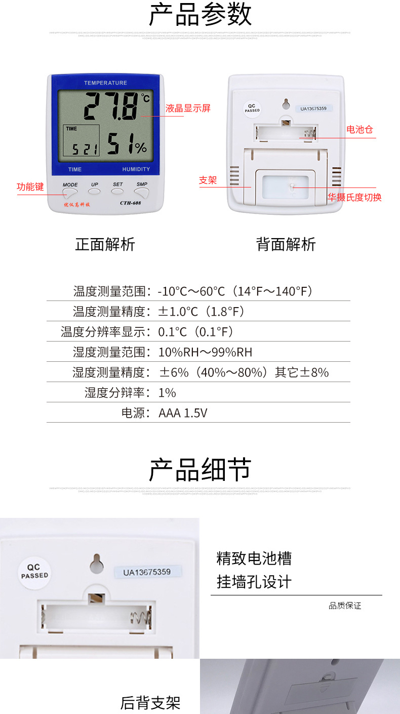 优仪高CTH608室内大屏幕家用温湿度计 高精度带电子闹钟温湿度计