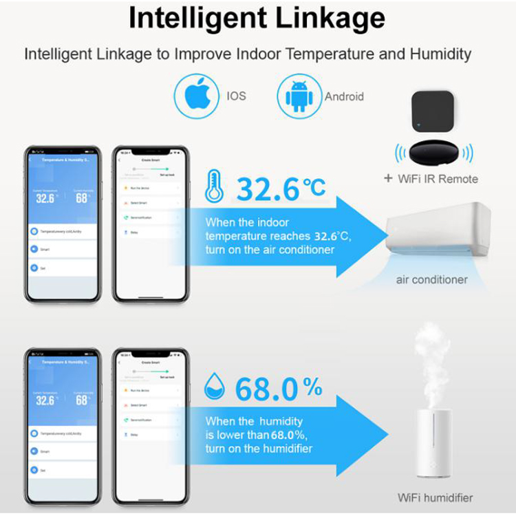 INTELLIGENT LINKAGE FUNCTION: When the environment changes, Alexa thermometer indoor can also perform intelligent linkage. For instance, when the ambient temperature surpass 30℃, the air-conditioner open automatically. Or when the ambient humidity lower 20%RH, the humidifier will spray, it can also linkage with smart light, make your home smarter.