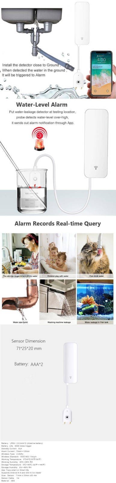 1. Water poof, water leak detection The sensor can detect whether there are water leakage at the installation location. If this is found, the information will be pushed to the phone immediately.