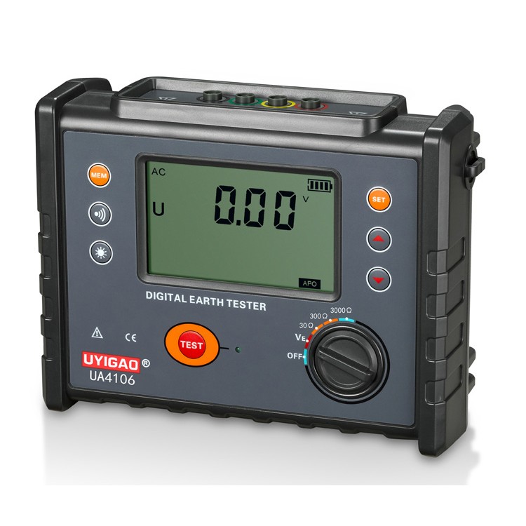 UA4106 digital earth-resistance tester is specially designed and manufactured for field measurement, adopting the latest digital and micro-processing technology, 3-pole or 2-pole method for earth resistance measurement, with a unique function of wire resistance verification, anti-interference capability and the ability to adapt to the environment, to ensure high precision, high stability and reliability for prolonged measure, which is widely used in electric power, telecommunications, meteorology, oil field, construction, lightning protection, industrial electrical equipment and other earth ground resistance measurement.
