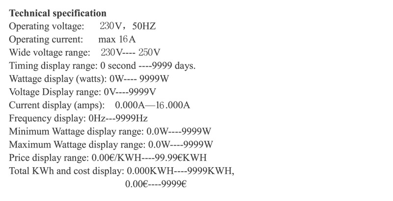 SAFETY PERFORMANCE - On the LCD screen an overload warning: If the current exceeds 16A or power exceeds 3680W, the "OVERLOAD" icon on the LCD will flash to warn the user and automatically interrupt the power supply to ensure the safety of household power. If it is less than 1.0W, it will be considered as the power consumption of the machine and the time will not accumulate.