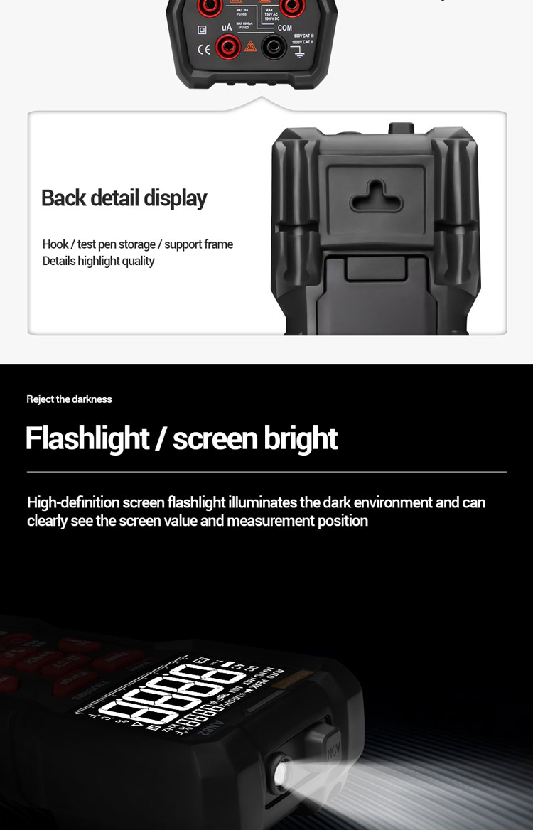 2.Portable Design: It's small and handheld, there is a back bracket for supporting multimeter.